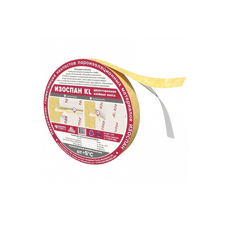 Инструкция по монтажу: при склеивании вертикальных и горизонтальных нахлестов материалов в кровлях и стенах клейкая двухсторонняя лента Изоспан KL наклеивается на верхний край укрепленного полотнища антиадгезионной бумагой вверх (Изоспан KL раскатывается с легким прижиманием к нижнему полотну на заданном расстоянии от края). Затем с требуемым по инструкции нахлестом укладывается или раскатывается верхнее полотнище материала. С ленты снимается антиадгезионная бумага и оба полотнища прижимаем друг к другу.